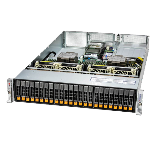 - 24x 2.5″ hot-swap NVMe/SATA/SAS drive bays; 2x internal M.2 NVMe/SATA drive slots; Optional RAID support via storage add-on card