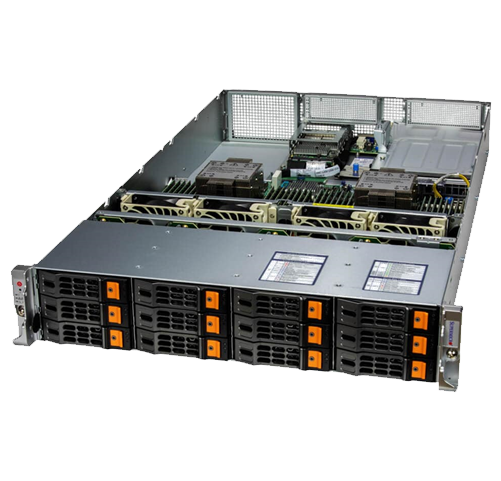- 12x front hot-swap 3.5″ SATA3 drive bays (Optional 2 hybrid Gen5 NVMe), SAS3 with additional SAS controller card